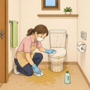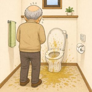 おじいさんになると排泄の勢いもなくなり、便座に覆い被さるくらいに近寄っても、手前にこぼれ、便座も床も、場合によっては衣類が汚れてしまうことがあり、更衣の必要も出てきます。