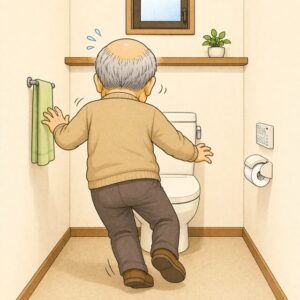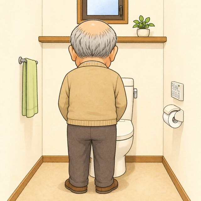 おじいさんはトイレで用を足す時、立ってする人がほとんどです。高齢になると特に転倒の危険性があるので座ってすることをおすすめします。